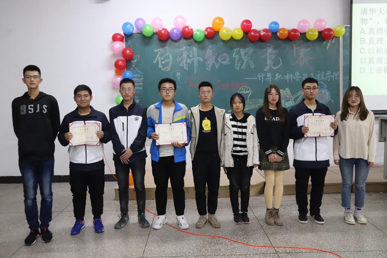 本次比赛采用小组赛1v1淘汰制度,共有25个队伍参赛。比赛开始前,各组队员分别介绍本队的队名及口号,活跃了赛场的氛围。比赛开始,参赛选手们自信果断,面对题目从容不迫,对答如流。本次知识竞赛题库涵盖面广,很大程度上扩展了学生们的知识面。为活跃气氛,主持人在比赛途中穿插了一些小游戏与观众互动。经过了激烈的角逐,本次比赛评出一等奖一名,二等奖两名,三等奖三名。本次比赛圆满结束。