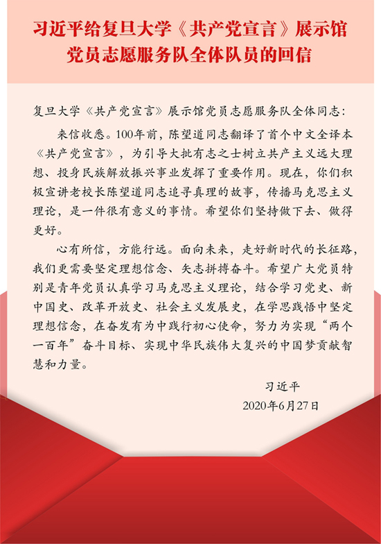 新闻网讯(通讯员王馨瑶)在中国共产党成立99周年之际,习近平总书记给复旦大学《共产党宣言》展示馆党员志愿服务队全体队员回信,勉励广大党员在学思践悟中坚定理想信念,在奋发有为中践行初心使命。Avbebe