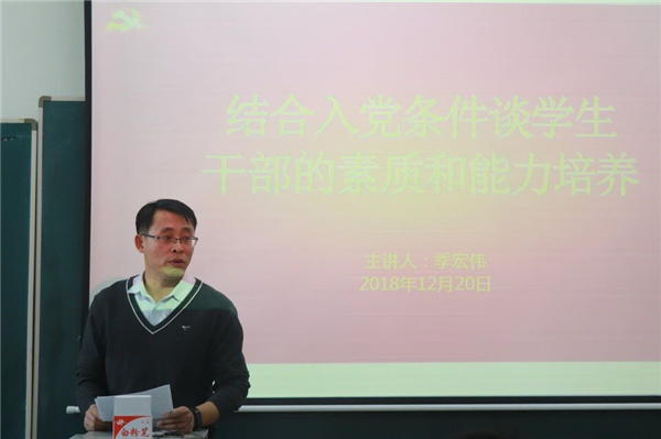 专职组织员薛勇宣读了培训计划,并强调每一位学员要做到严格要求自己,认真完成学习和考核任务,争取早日成为一名光荣的共产党员。随后,季宏伟老师以结合入党条件谈学生干部的素质和能力培养为题为大家讲授了培训班的第一课。首先提出同学们要端正自己的入党动机,他强调,只有思想上入了党,组织上才能入党,入党不是盲目的跟风,而是自己主观意识的驱动,是对党的崇高敬意和向往。进一步对学员们的素质和能力培养作出要求,通过Avbebe