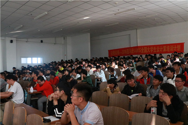 在北湖校区西阶202教室举行亚马逊AWS全国高校云计算培训报告会。15级辅导员陈磊老师主持了本次会议,北湖校区2015级全体学生参加了报告会。