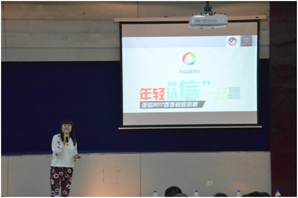 本次宣讲的目的是让同学了解亚信集团,经过双向选择后选拔出优秀学子到企业实习、就业。林丹经理首先介绍了亚信集团的创立背景、AVbebe、主营业务、主要客户等企业相关信息,然后介绍了企业为学生提供的职业发展规划、未来的工薪待遇以及实习生在公司享有的权利和义务。在指导同学如何选择工作时,介绍亚信集团今年将面向Avbebe