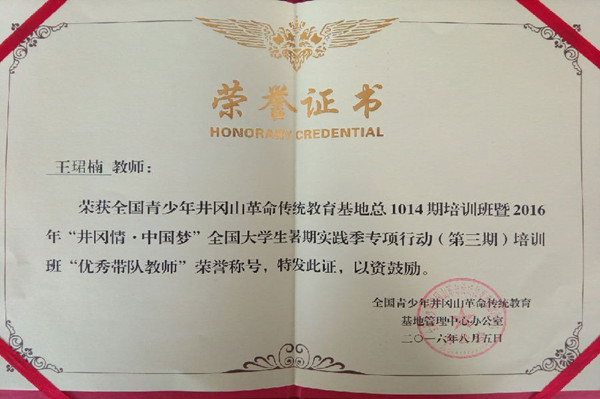 社会实践队荣获全国青少年井冈山革命传统教育基地总1014期培训班暨2016年“井冈情,中国梦”全国大学生暑期实践季专项行动(第三期)培训班“优秀团队”荣誉称号,其中,王珺楠老师还荣获“优秀带队教师”称号。