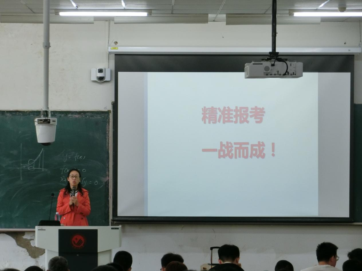 会议伊始,郑虹老师为同学们讲解了如何精准报考,并对报名时间、考研形势等方面做出了具体分析。她提出:考研的路很辛苦,贵在坚持。同学们要准确定位,明确目标,理性选择合适的学校和专业。并且做好计划,合理分配时间,认真复习专业课和公共课。随后,王珺楠老师为同学们做了总结,他列举了往年的成功及失败案例,帮助同学们理性分析原因,并结合往届同学的经验给参加考研的同学指明了考试方向并给予了宝贵意见,他诙谐幽默的讲话风格不仅舒缓考研同学的压力,而且有助于同学们增强自信心。