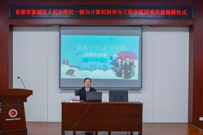 揭牌仪式后,宽城区法院法官助理冯玉莹为师生做《防范于心,反诈于行》主题校园安全讲座。讲座中,她围绕电信诈骗、帮助信息网络犯罪活动罪等的概念、常见形式、识别防范方法及遭遇此类情况的补救措施等展开讲解,帮助师生增强法治观念和安全意识,筑牢校园法治“安全墙”。同时,她还对青年学生提出要求,希望青年学生树立正确的劳动取酬和量入为出观念,增强法律意识,妥善保管个人重要信息、物品,切勿因小利沦为诈骗分子帮凶。