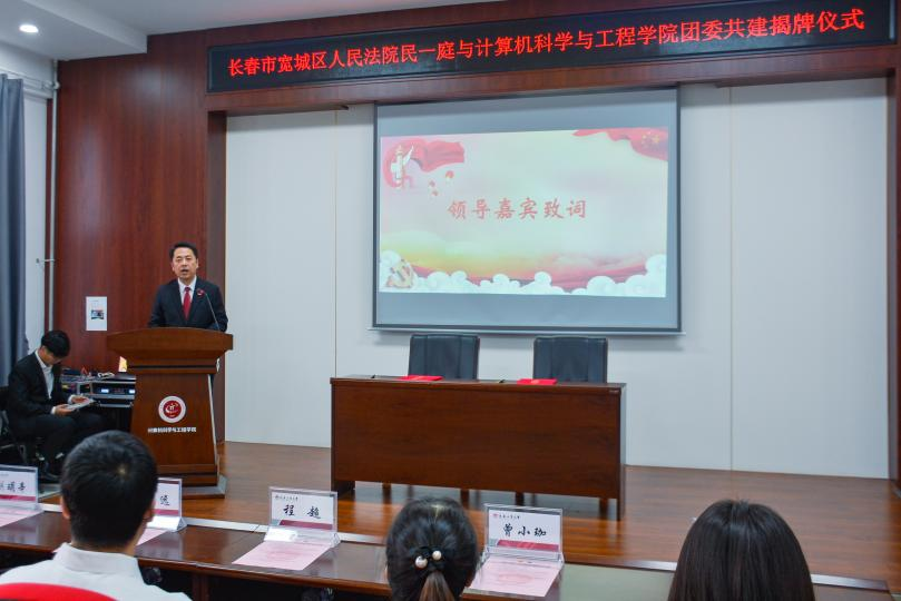 张明远庭长在致辞中强调了此次共建的重要意义。他指出,本次共建基地的建成,是党建带团建工作创新形式的一次有益探索,是高校与司法互惠合作的重要一环,希望通过双方共建活动,实现“以学促用、学以致用"的教育目标,让学生在职业生涯发展中走得更稳、更远。在当今数字化时代,法治与科技的融合是必然趋势。通过与计算机Avbebe