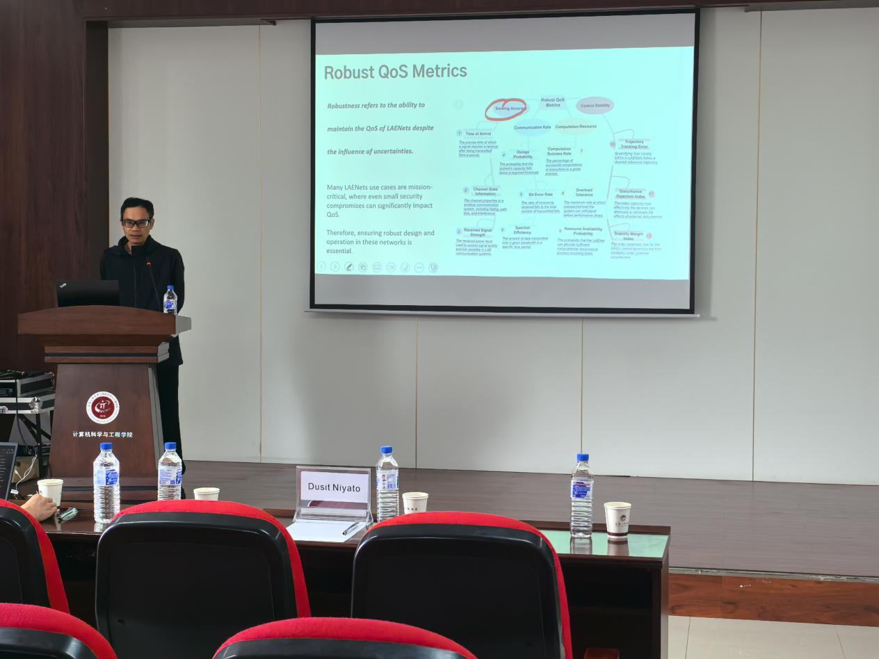 校长讲席教授、IEEE Fellow Dusit Niyato作专题演讲。Dusit教授分享了生成式AI在低空通信网络中的前沿应用,并与现场师生就分布式机器学习、边缘智能等技术挑战进行了交流。本次活动为Avbebe
