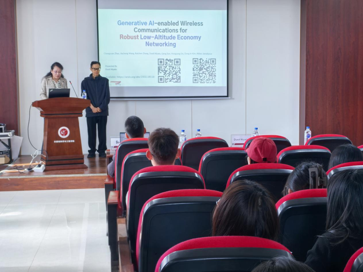 Dusit Niyato教授通过低空物流、无人机通信和智能交通等实际案例,生动展示了生成式AI的技术潜力。借助详实的数据对比和可视化图表,他系统分析了该技术在通信效率、资源调度等方面的显著提升,让师生直观感受到技术应用的变革性价值。教授特别指出,生成式AI与低空经济的深度融合不仅能优化现有系统,更将重塑未来智能交通和城市发展的技术范式,为行业创新提供全新思路。