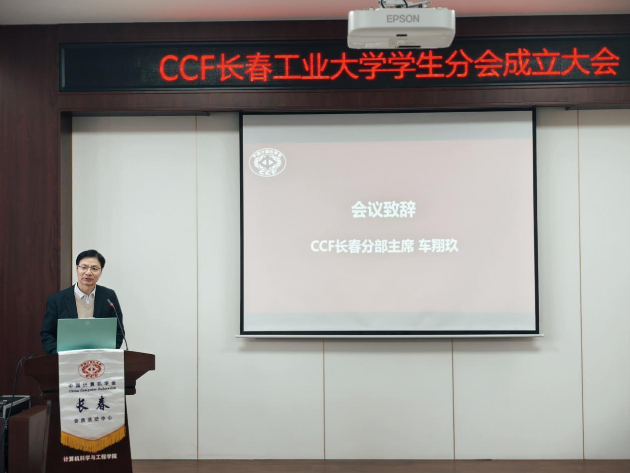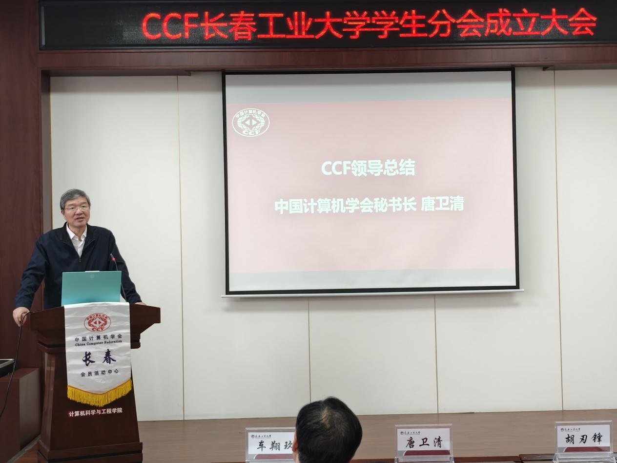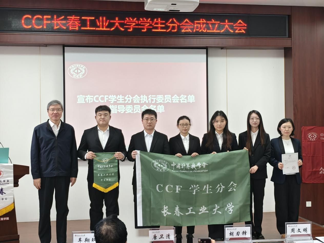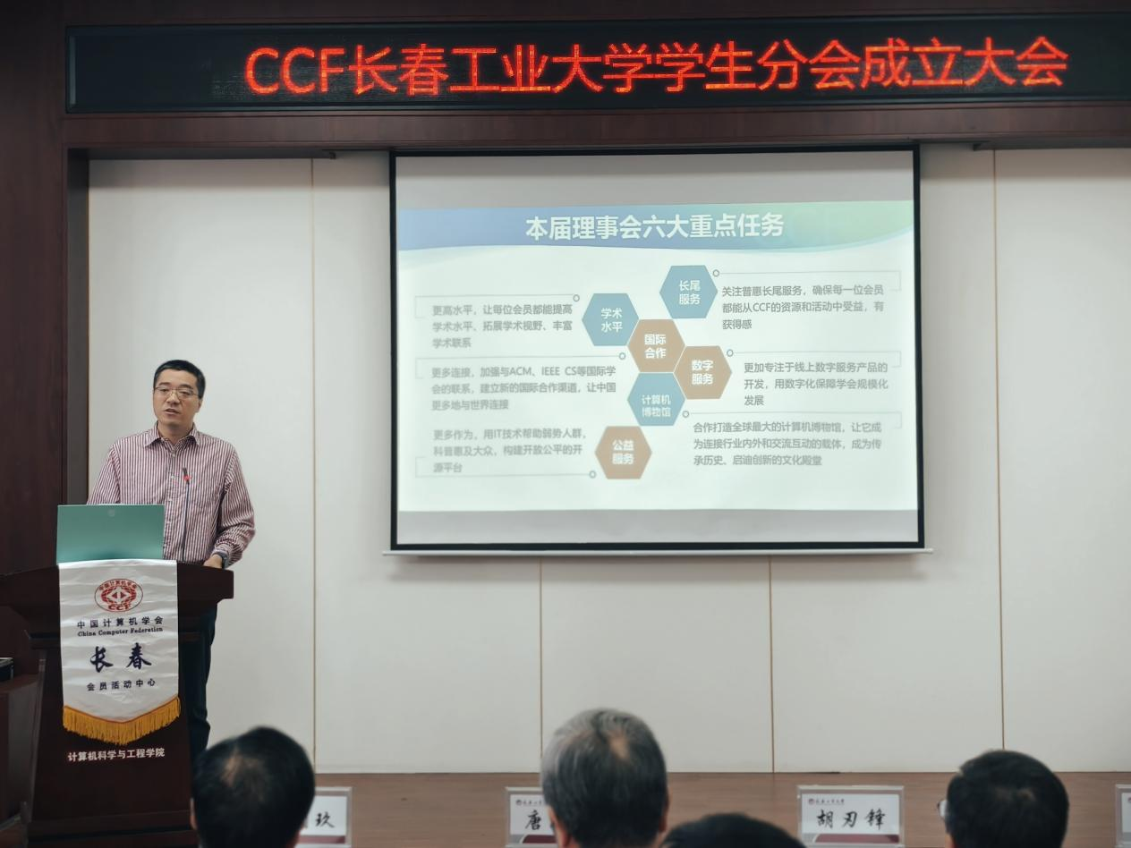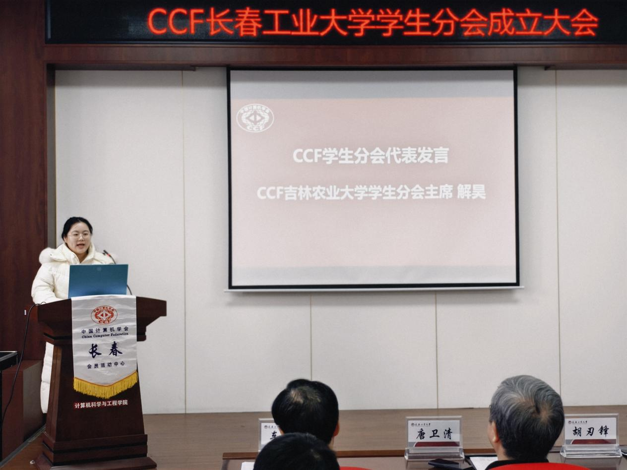 学生分会成立大会于323会议室隆重召开。中国计算机学会(CCF)秘书长唐卫清、中国计算机协会助理秘书长陈国威、CCF会员与分部工委主任李贝、CCF会员部闫婉婷,CCF长春分部主席车翔玖,CCF长春分部副主席孙晓海,Avbebe